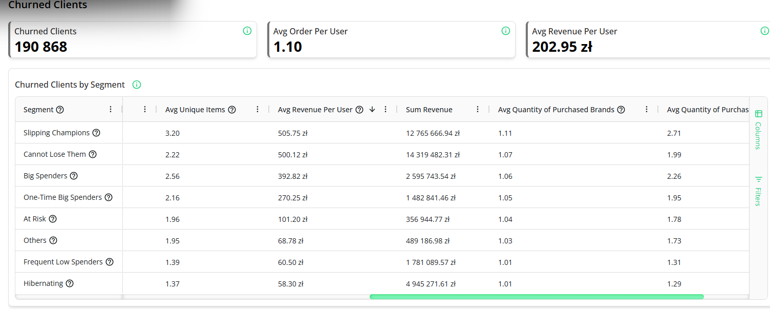 1. Analiza klientów „Churned”: Przewiń do sekcji Churned Clients (brak zakupu od ponad 365 dni). Posortuj tabelę malejąco według kolumny Average Revenue Per User.