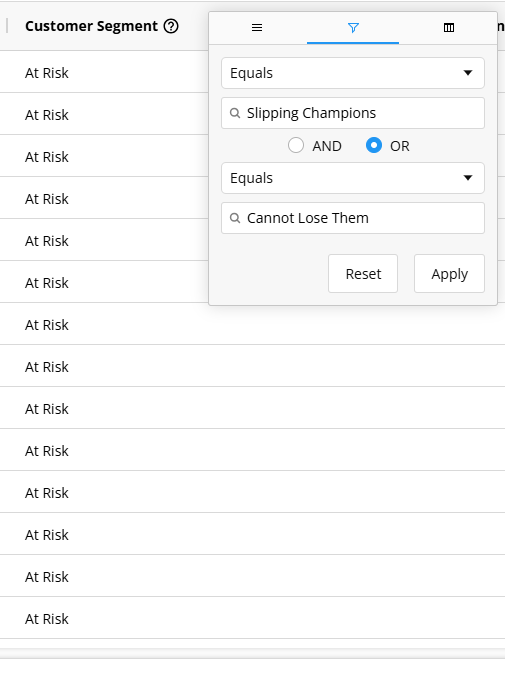 • W kolumnie „Customer Segment” ustaw filtr Equals dla segmentów o najwyższym ARPU (np. Slipping Champions i Cannot Lose Them), używając łącznika OR.