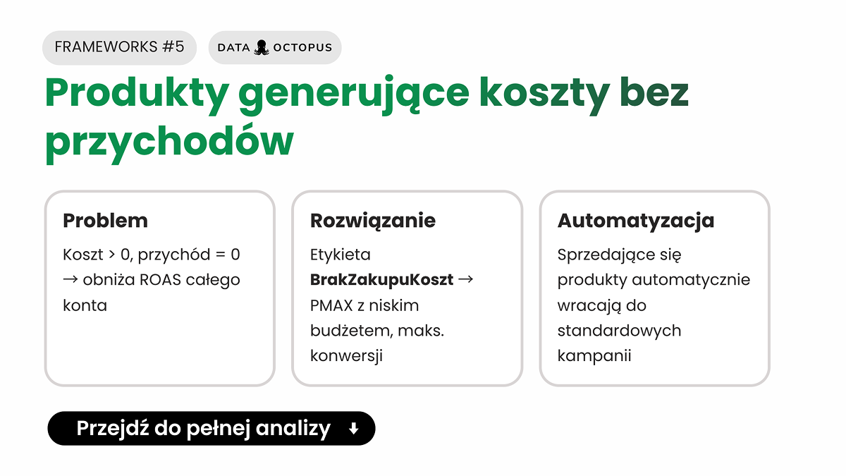 Zarządzanie produktami z segmentu „BrakZakupuKoszt” to proces, który wymaga połączenia twardych danych z elastyczną strategią. Kluczowym wnioskiem z tego Frameworks Data Octopus jest to, że nie każdy produkt, który dziś nie sprzedaje, jest produktem straconym. Często wystarczy zmiana kampanii, nowa strategia stawek lub drobna korekta ceny po stronie sklepu, by przywrócić go do obiegu i zacząć na nim zarabiać.
