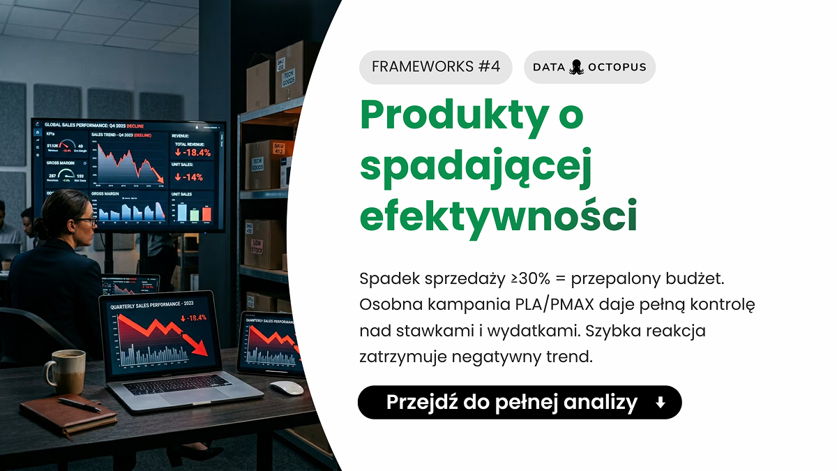 Jeśli przyczyny spadków nie wynikają z błędów w ofercie, zalecamy izolację tych produktów do dedykowanej kampanii PLA/PMAX poprzez wykorzystanie przygotowanej wcześniej grupy produktów. Nadanie im odrębnego budżetu pozwala na odzyskanie kontroli nad ekspozycją i wymusza na algorytmach systemów reklamowych ponowną naukę potencjału tych produktów.