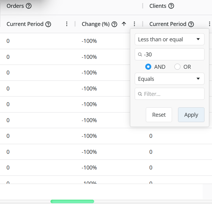 3. Ustaw operator na less than or equal i wprowadź wartość -30 (procentowy spadek zamówień w skali ostatnich 30 dni).